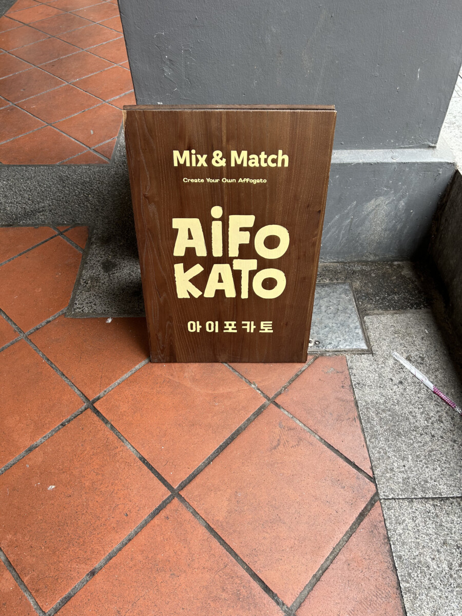It states Mix & Match, Create your own Affogato. Clearly spelt out and with a sprinkle of Korean words at the bottom of the sign, you could deduce that this is a Korean cafe selling affogato which you can mix and match.