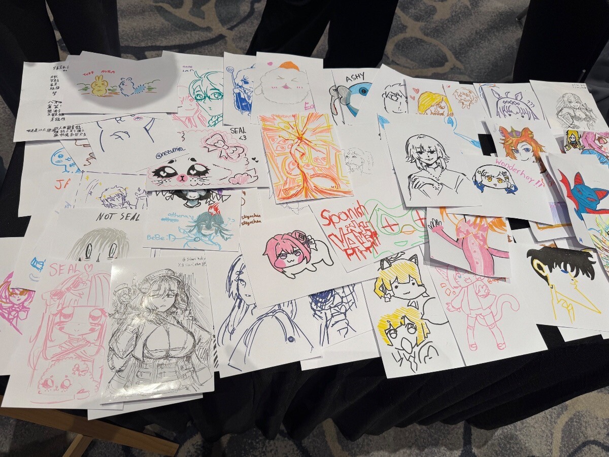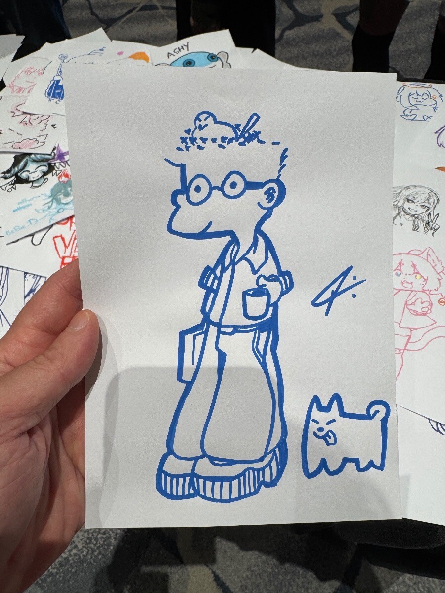 My style is heavily influenced by old-school Hong Kong comics—can any of you guess which characters I was referencing? Feel free to drop your guesses in the comments! In the spirit of the event, I participated in a drawing exchange. In exchange of my contribution, I picked up a sketch of a “bookworm” guy walking his dog. He looked so chill amidst the surrounding chaos, and honestly, I related to that vibe perfectly.