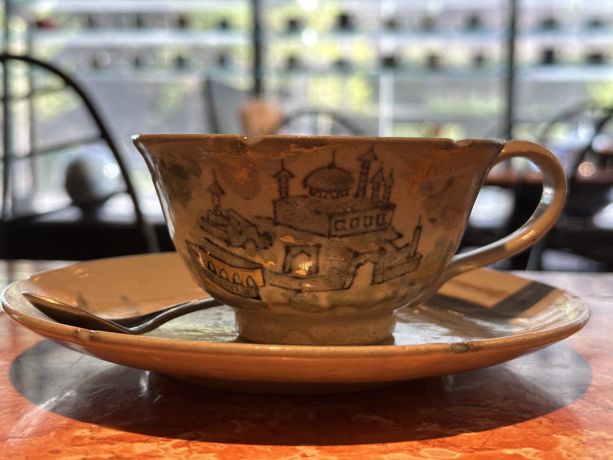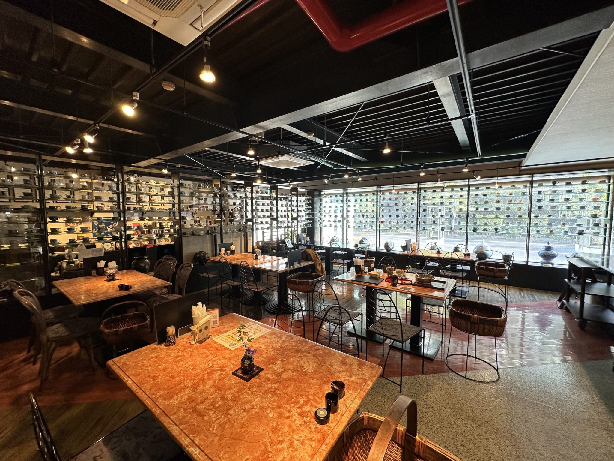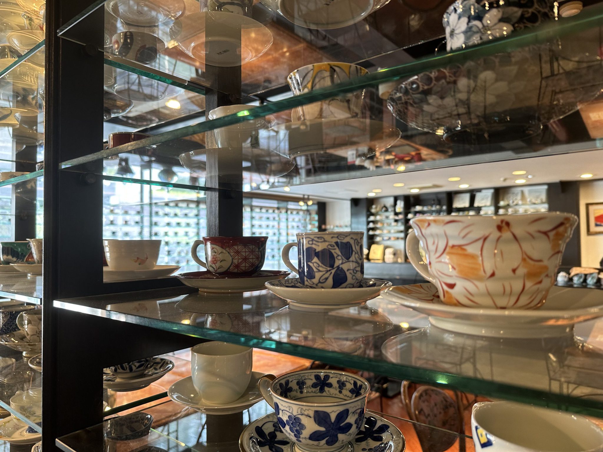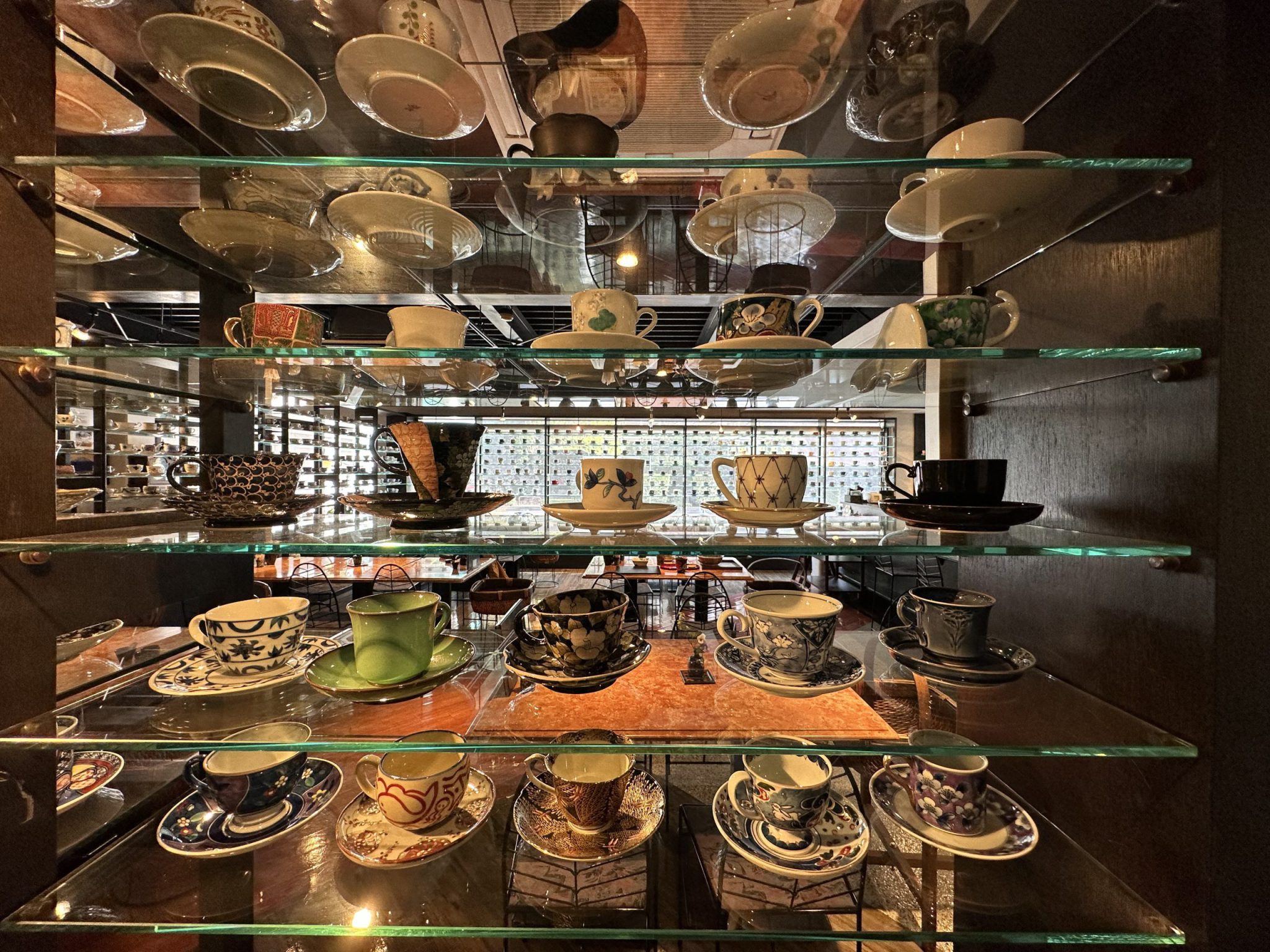 The entire cafe is lined with porcelain cups and saucers of different designs.