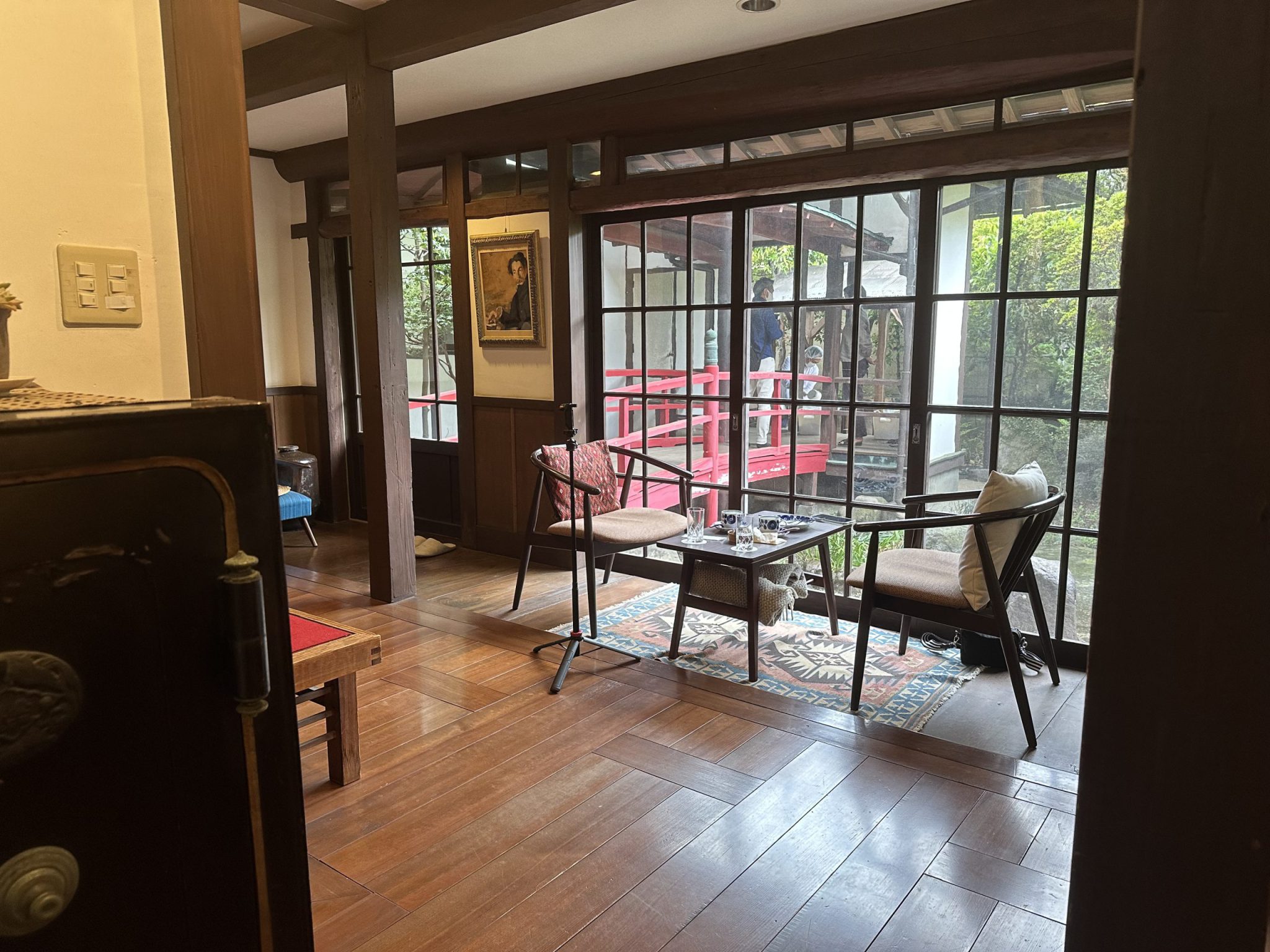 We sought shelter at a cafe built within a preserved house. I forgot to take a picture of the cake and matcha. Below is the seat we took, which had a nice view of the zen garden outside.